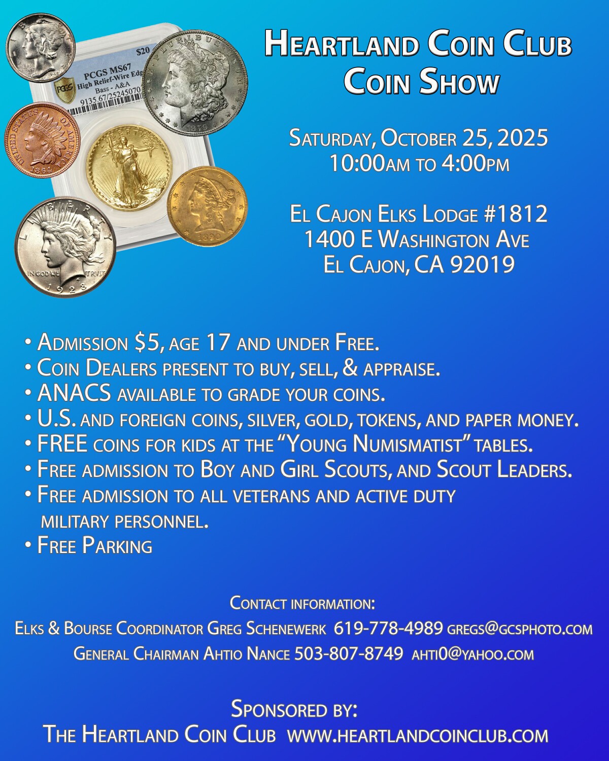 Admission: $5.00 (Free admission for Heartland Coin Club members, as well as San Diego County Coin Club members with a club id card.) Admission is free for children under 16 when accompanied by an adult, as well as for Boy Scouts and Girl Scouts in uniform.